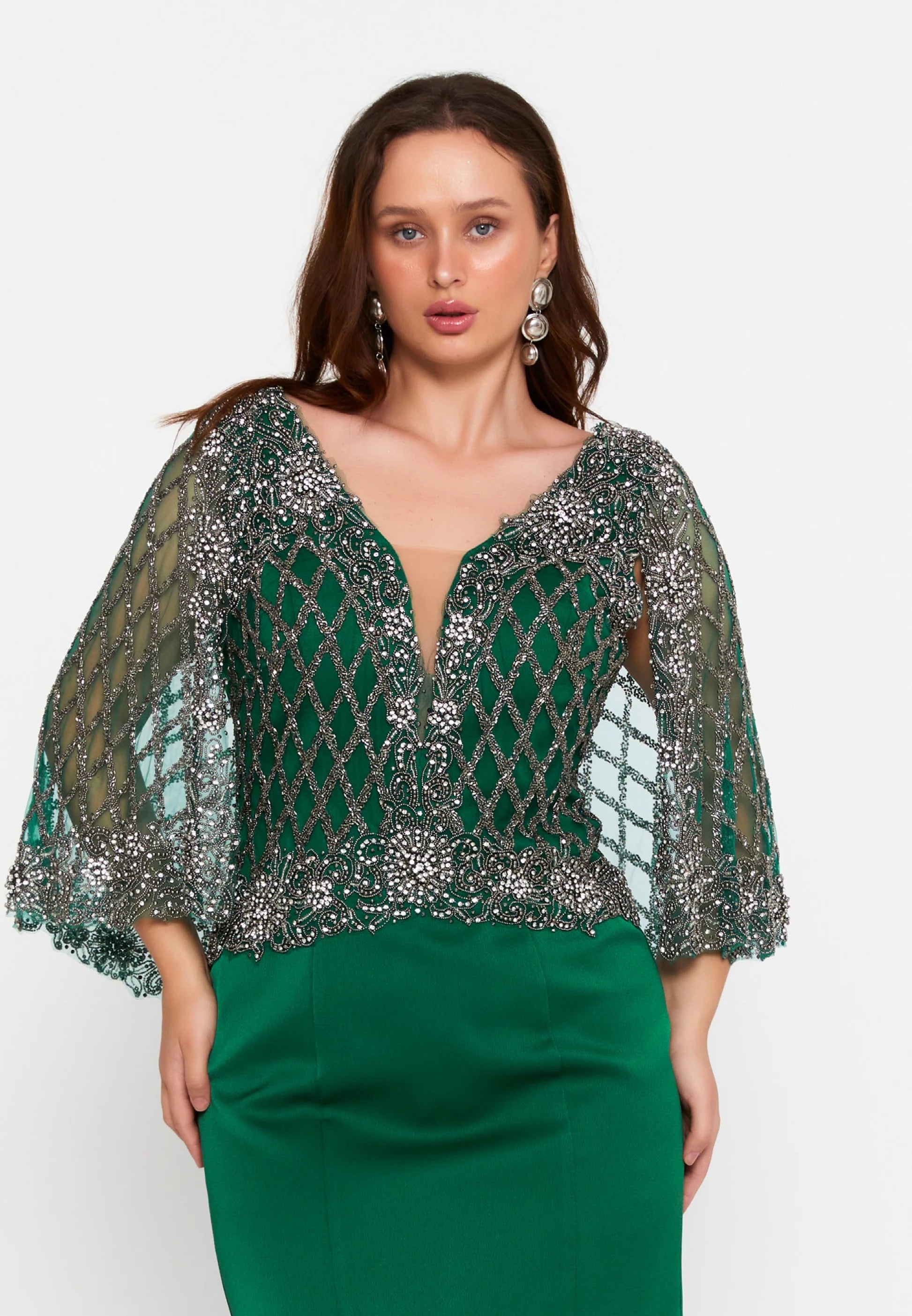 A breathtaking emerald gown featuring a beaded V-neck bodice with flowing cape sleeves and a smooth, fitted skirt that flares beautifully at the hem. Elegant, flattering, and perfect for mothers of the bride, formal events, and special occasions.