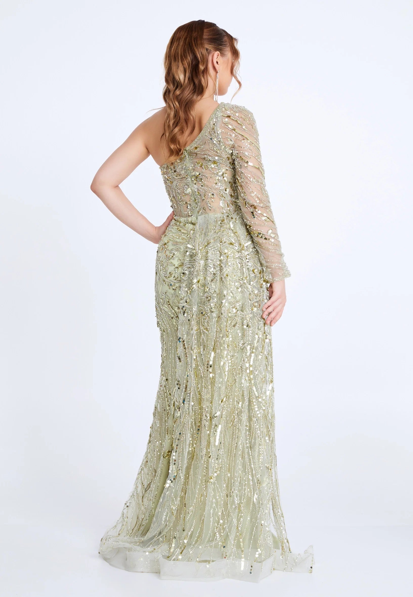 Make an unforgettable entrance in this stunning sage green evening gown. Designed with a glamorous one-shoulder sleeve, shimmering hand-placed sequins, and a flattering V-neckline, this dress blends elegance with modern sparkle. The fitted silhouette flows into a soft mermaid skirt with a front slit for easy movement and a touch of drama.
