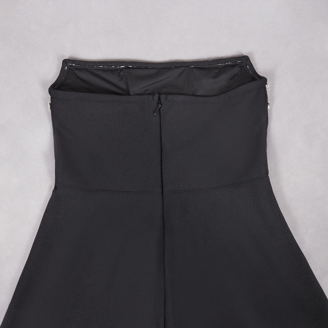 A chic black mini dress featuring a strapless neckline and sparkling crystal embellishments.